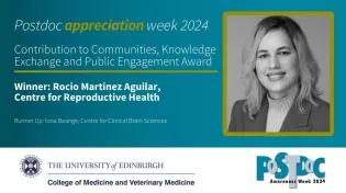 The National Postdoc Appreciation Week (PAW), which aims to celebrate the fantastic work that postdoctoral researchers do within the University community, took place between the 16-20 September this year. Postdocs at the Institute for Regeneration and Repair took part in a packed programme of activities across the week including The Big Postdoc Quiz, the CMVM PAW Awards and the BioQuarter Postdoc Symposium.CMVM PAW AwardsWe are continuously inspired and impressed by our Postdocs’ hard work and dedication to science, student care and community engagement. As part of the appreciation week, the College of Medicine and Veterinary Medicine presented Postdoc Awards across several categories including citizenship, scientific advancement and student support. Rocio Martinez Aguilar from our Centre for Reproductive Health won the award for her Contribution to Communities, Knowledge Exchange and Public Engagement. Rocio is an enthusiastic supporter of engaging with school age young people, helping to establish schools workshops, supporting out local schools and as is a core member of the CMVM-wide Science Insights work experience week, the only full time academic on the team. Luciana Luque and Giuseppe Torrisi, from the Centre for Regenerative Medicine, were named Runner-Up for Science Advancement Award as a joint nomination. A total of thirteen IRR Postdocs were nominated for the CMVM Postdoc Appreciation Week awards and all demonstrated positive contributions to the CMVM community through their work, attitude, value and impact on others.Contribution to Citizenship: Charlotte Repton (CRM)Outstanding PostDoc: Isobel Mouat (CIR), Eleftheria Chatzantonaki (CRM), Utsa Karmakar (CIR), Bert Malengier-Davlies (CRH)Student Support and Supervision: Rebecca Smith (CRM), Lorraine Pfavayi (IRR SBS), Eleftheria Chatzantonaki (CRM), Madeleine Cowie (CRM), Lizi Hegarty (CRM)BioQuarter Postdoc SymposiumOn Monday 16 September, postdocs from the IRR joined in the BioQuarter Postdoc Society Symposium at the new Usher Building.After a series of flashtalks and poster presentations, Florent Petitprez a PI at the Centre for Reproductive Health shared his insights into fellowship applications and asking for funding.This was followed by a presentation from Natalie Jones, who manages the multidisciplinary u-Care project, on her transition from postdoc to project manager within a university setting. The event concluded with a prize giving ceremony, where CRH’s Meaghan Griffiths was awarded the Best Flashtalk prize for her presentation on the impact of endometriosis on anti-Mullerian hormone and consequences for fertility.Meet the PostdocThe College of Medicine and Veterinary Medicine launched a social media series #MeetThePostdoc asking Postdocs to share their wisdom and insight from their role.Mariska Simpson from the Anderson Lab at the Centre for Inflammation Research shared her thoughts along with Rana Fetit from the Williams Lab within the Centre for Regenerative Medicine and Bert Malengier-Devlies at the Centre for Reproductive Health. [A memorable achievement was] conducting my first independent experiment after being out of the lab on maternity leave. I now know that I won't forget how to pipette, however long I am out of the lab!” Mariska Simpson Enjoy the process. It's a whole package - the ups and downs, the failed experiments and the exciting results. Follow the truth wherever it may take you and do not stop questioning. Rana Fetit As a postdoc, teaching a mentoring students is rewarding, especially seeing the gratitude and further progress in academia or industry…I highly recommend pursuing a postdoc. It’s a great opportunity to further develop as a researcher and build your own identity. Bert Malengier-Devlies Science Insights - find out more This article was published on 2024-10-01